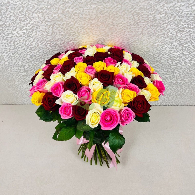 Свежие красные, розовые и желтые розы в единой композиции из 101 штуки будут радовать получателя не один день. А их аромат напомнит о весне.