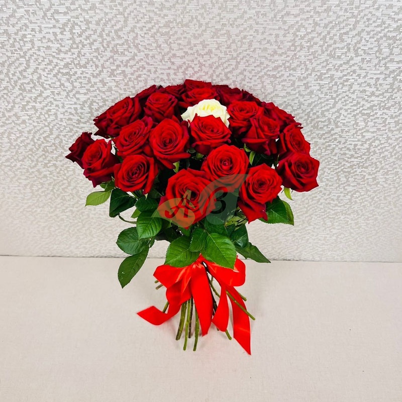 Не знаете какие розы подарить: красные или белые? Выбирайте контрастное сочетание двух цветов в букете из 25 штук. Идеально ровные стебли шикарных роз перетянуты лентой, чтобы букет держал форму и не распадался в вазе.