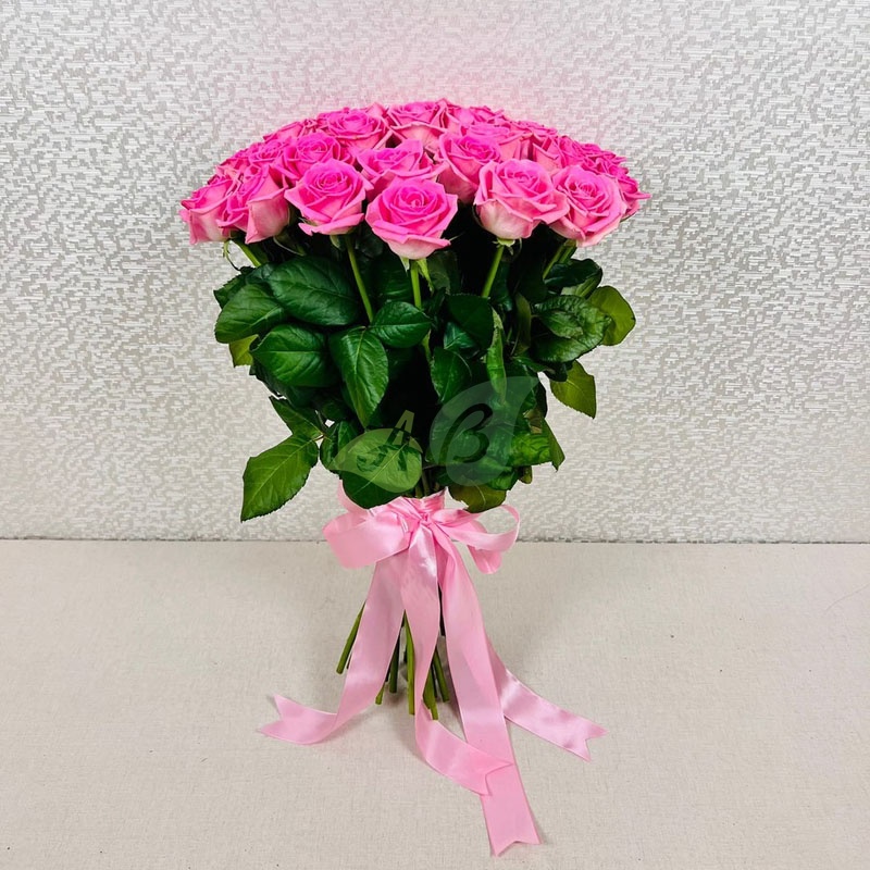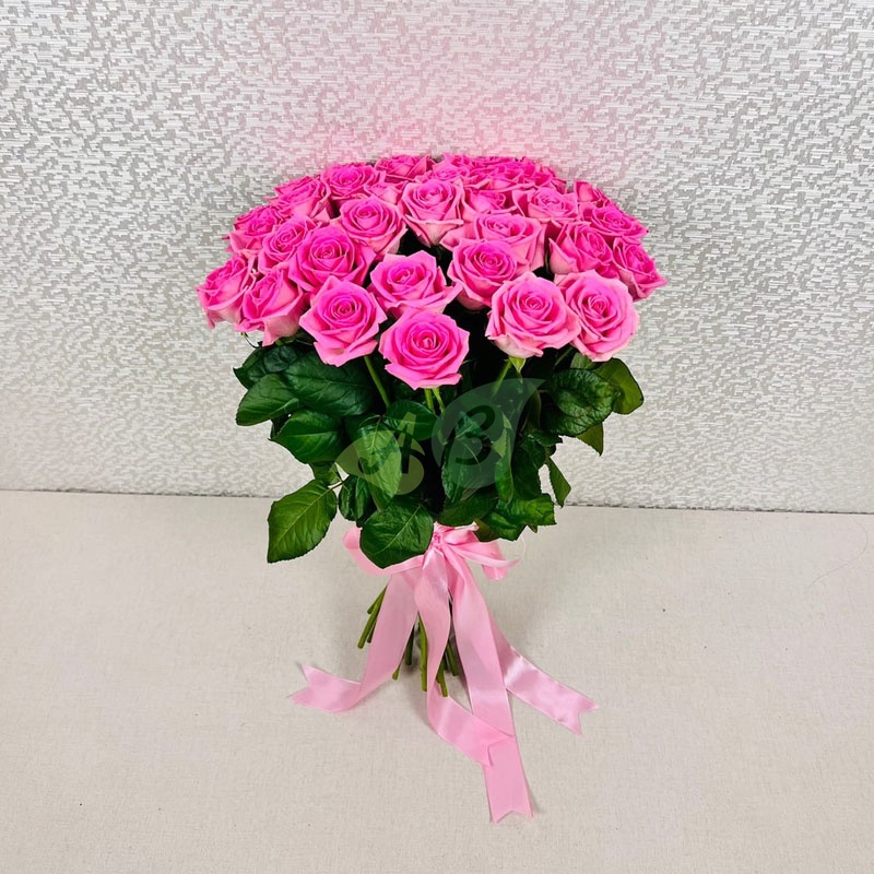 - Роза - 35 штук, цвет - розовый, длина стебля - 60 см;