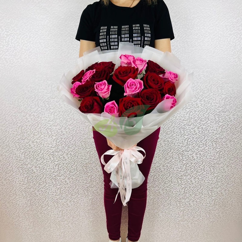 Количество цветов в разноцветном букете из розовых и красных роз можно выбирать самостоятельно (15-201 штука). Составьте маленький или огромный букет на ваш вкус, а мы привезем его по любому адресу в Прокопьевске.