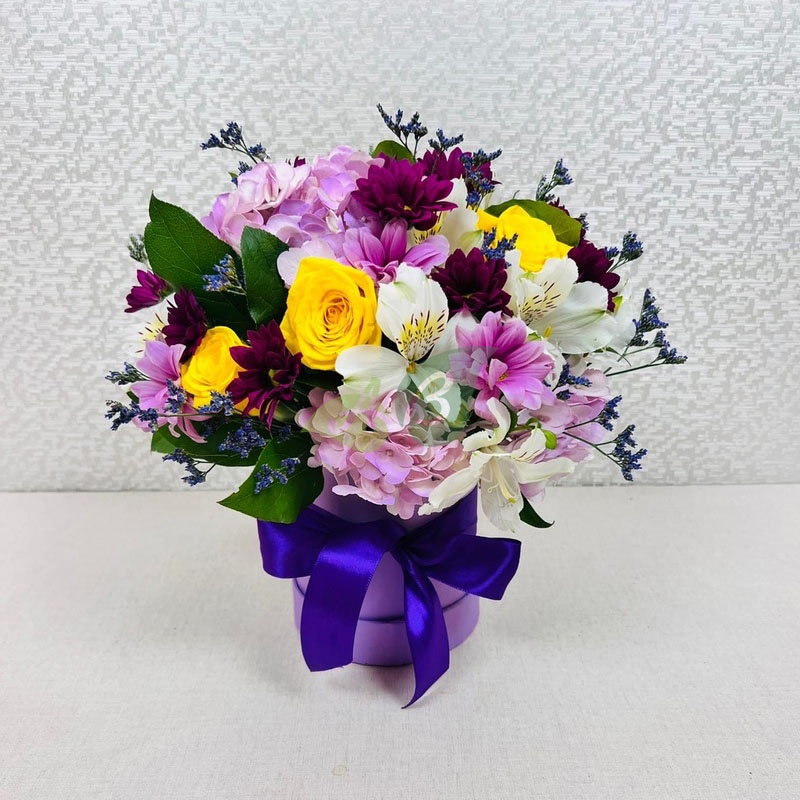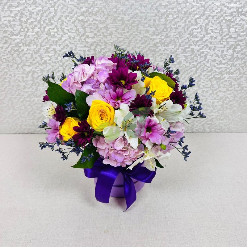 При покупке композиции из фиолетовых цветов в коробке доставка по Прокопьевску будет бесплатной.