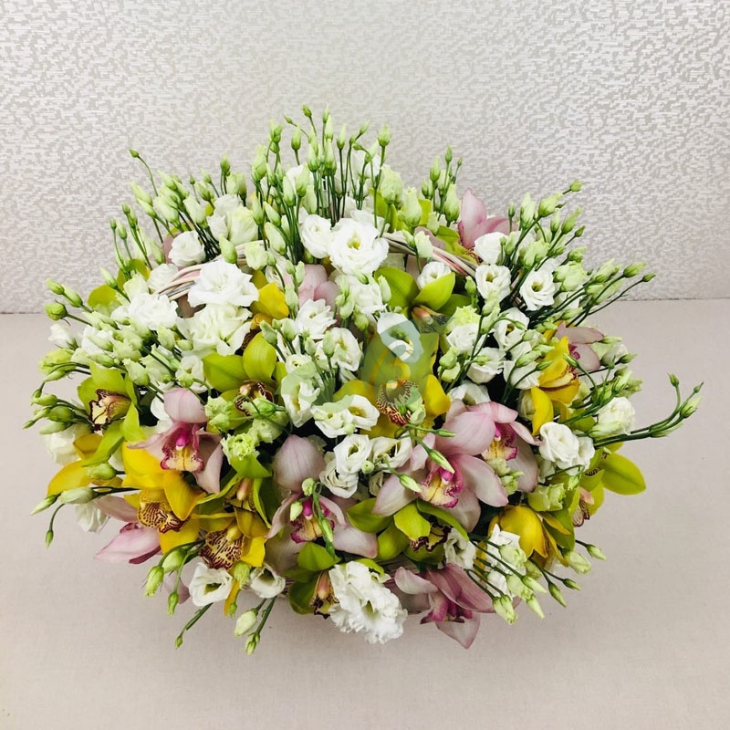 Огромная корзина с орхидеями и эустомой
