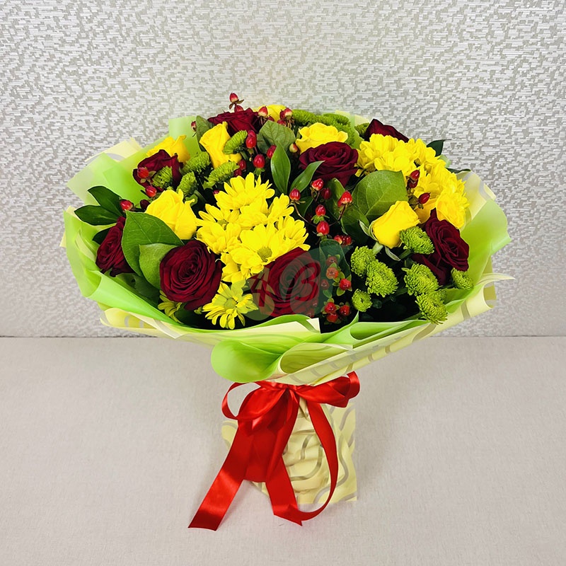 Цветочный подарок – это не просто букет цветов с доставкой. Это изысканная композиция, которую бережно собрали руки наших флористов. 15 роз красного желтого цвета и несколько хризантем в обрамлении насыщенной зелени – это стильно и очень модно.