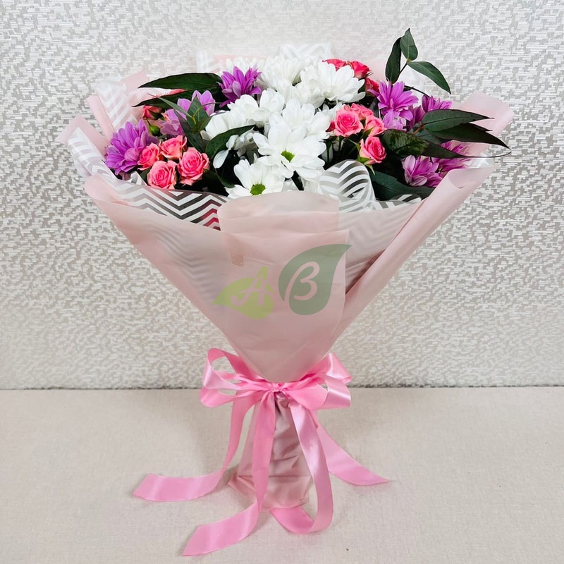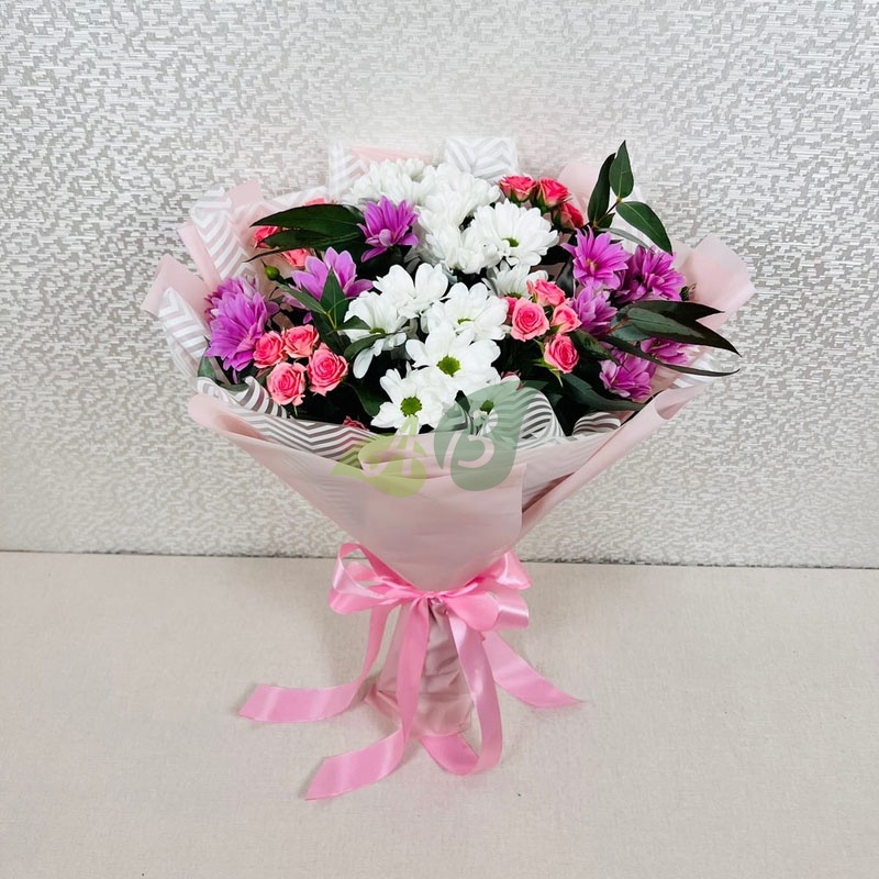 Букет цветов из хризантем и кустовых роз Радужная капель