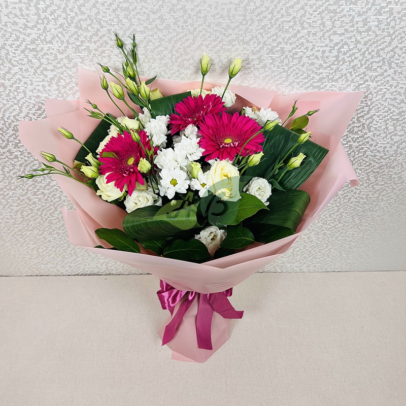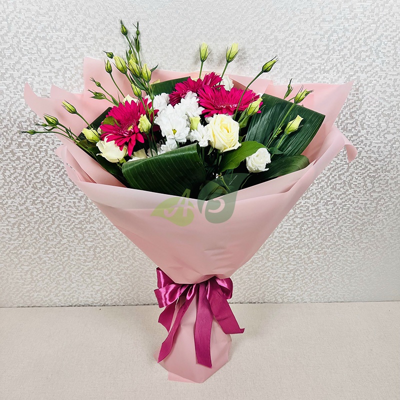Сборный букет из гербер, шикарных роз, нежных хризантем, ароматной аспидистры и фрезии украсит любой праздник. Это очень изысканный вариант для подарка самым милым и любимым. Заказать эти цветы в роскошной композиции можно в качестве поздравления с 8 марта, днем рождения, выпиской из роддома или крестинами.
