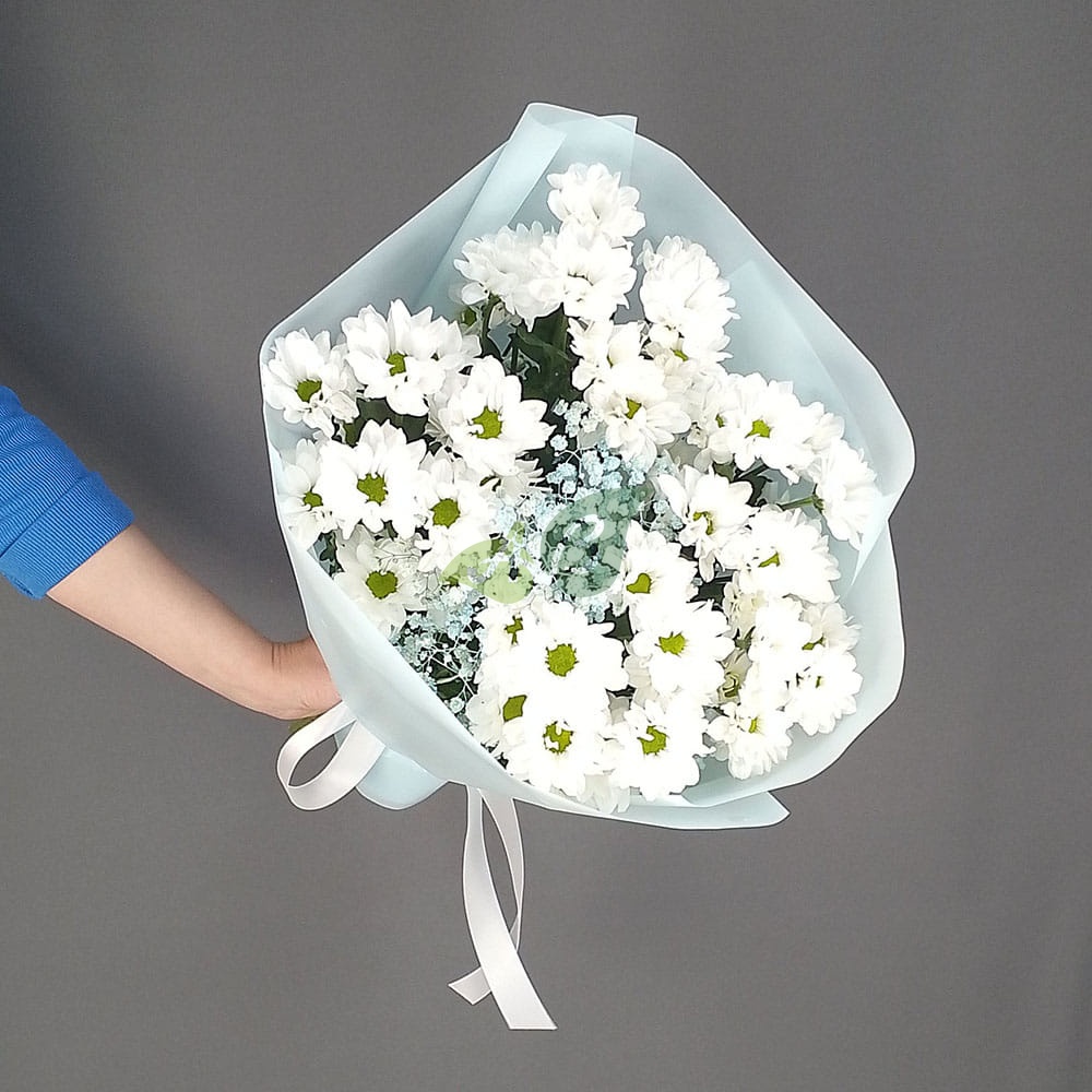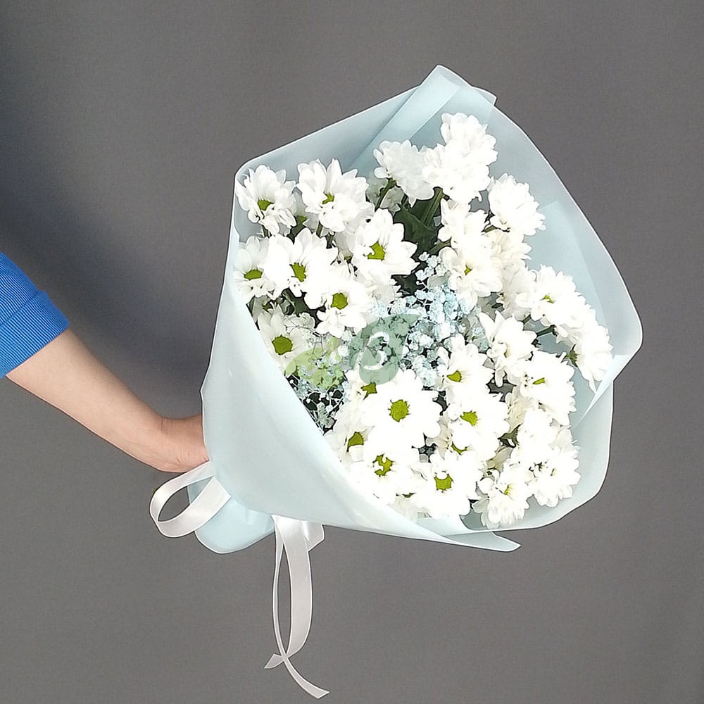 Букет из кустовых ромашковых хризантем – это мило и очень приятно. Самая желанная и нежная обязательно оценит этот широкий жест, а аромат цветов будет еще долго напоминать ей о вас.
