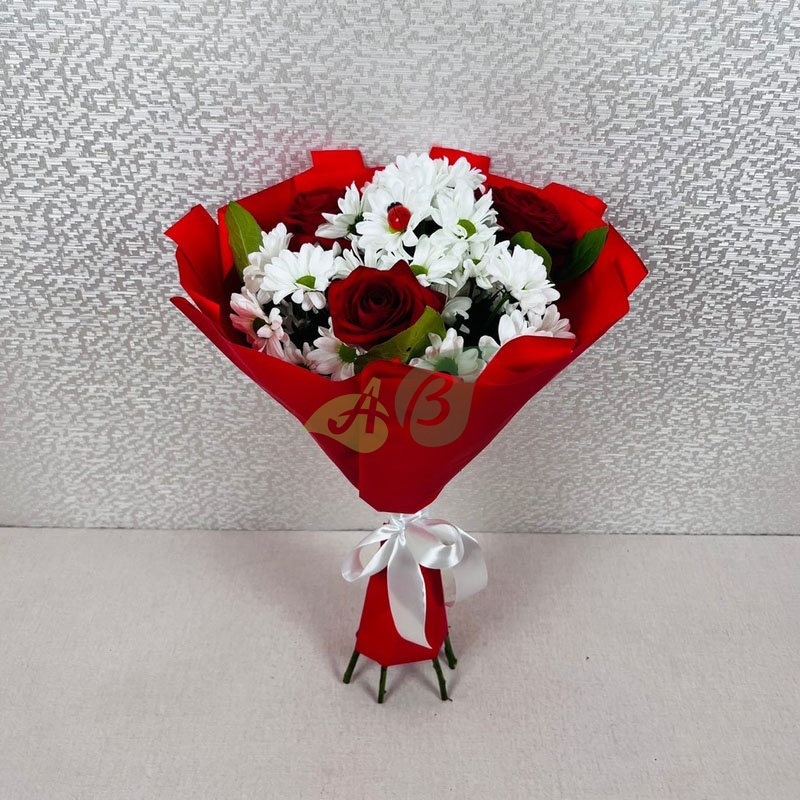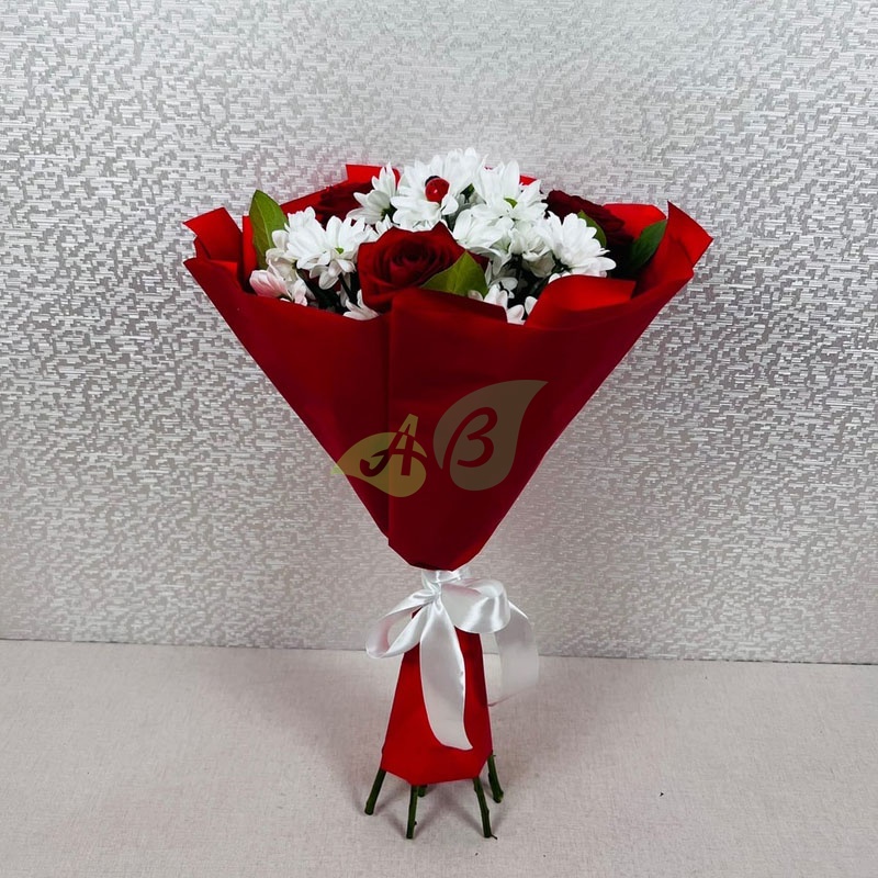 “Желанная” – это три красные розы в окружении белых хризантем. Такой букет не стыдно заказать в подарок для девушки, мамы или подруги на 8 марта или другой праздник.